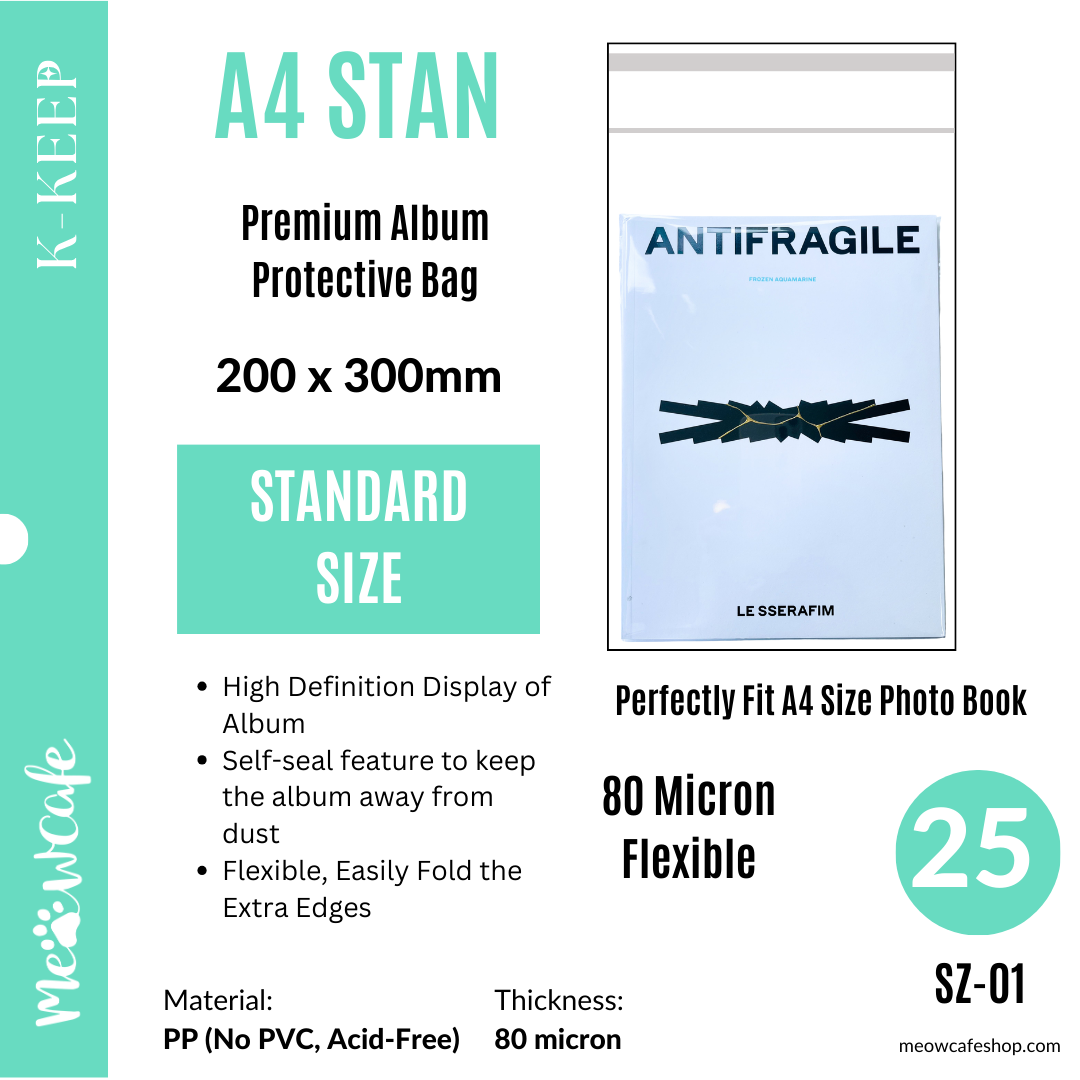 A4 Standard 200x300mm Premium Kpop Album Protective Bag | 80 Micron Flexible Thickness, Superior Clarity, PP Material + 40 Free Corner Tabs