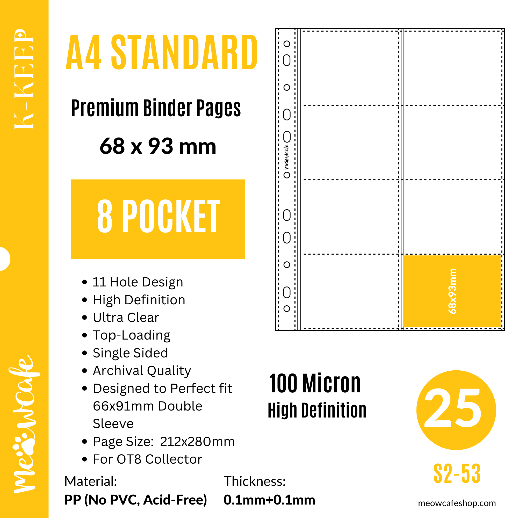 K-KEEP [A4 Standard] - 8 Pocket (68x93mm)- 11 Holes Premium Binder Pages, 100 Micron Thick, High Definition (Pack of 25) - (S2-53)