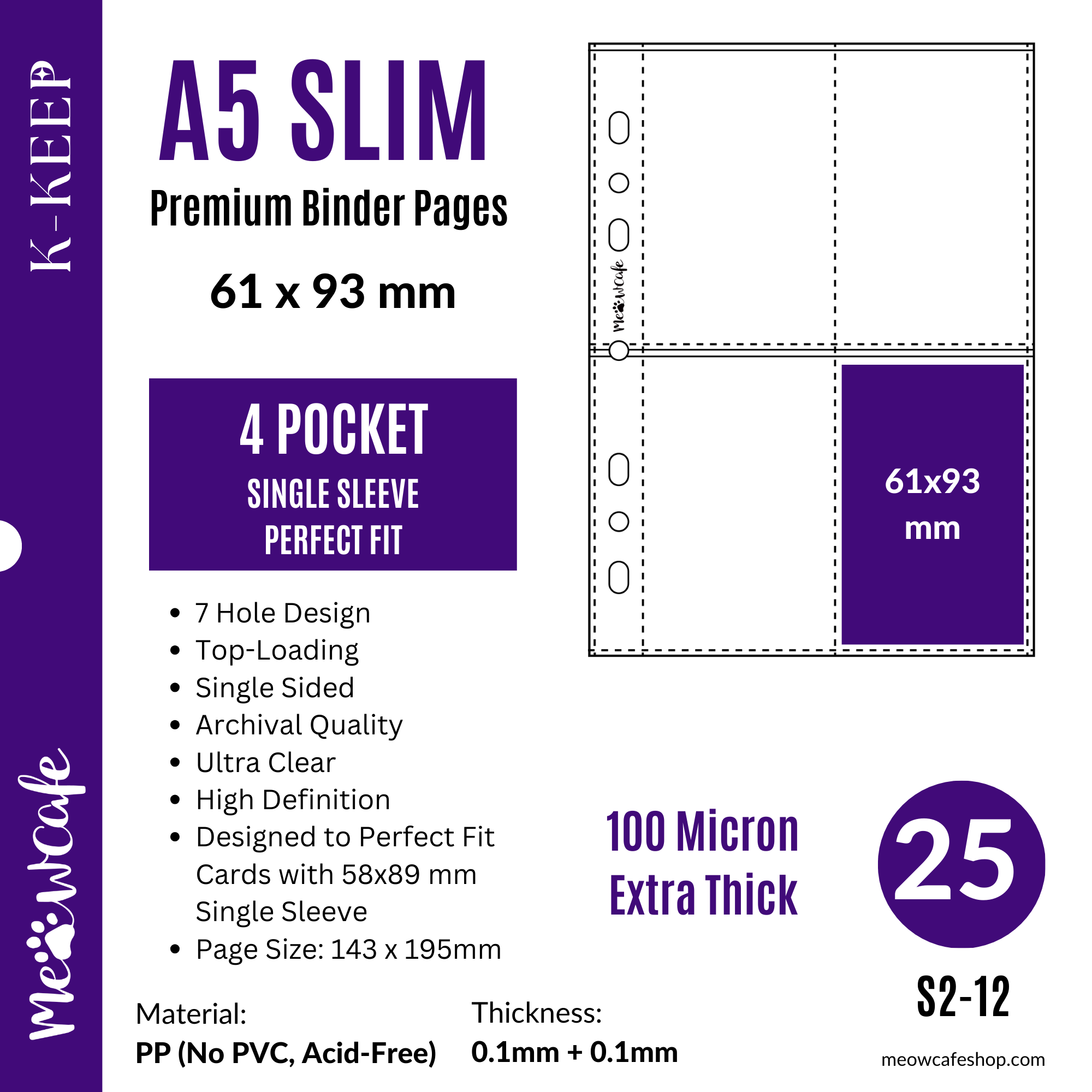 ![K-KEEP [A5 Slim] 4 Pocket - 61x93mm Single-Sided 7 Holes Premium Binder Pages, For 59.5x91mm Outer Sleeve Perfect Fit, 100 Micron Thick, High Definition (Pack of 25) S2-12](http://meowcafeshop.com/cdn/shop/files/2_2ab4bd15-adb3-46a8-a43e-e8b4e6071a18_medium.png?v=1703817662)