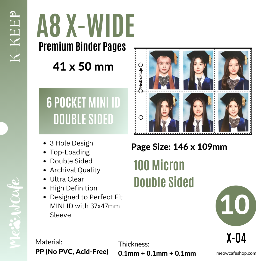 K-KEEP [A8 X-Wide] 6 Mini ID Pocket - 41x50mm Double-Sided 3 Holes Premium Binder Pages, 100 Micron Thick, High Definition Glossy (Pack of 10)