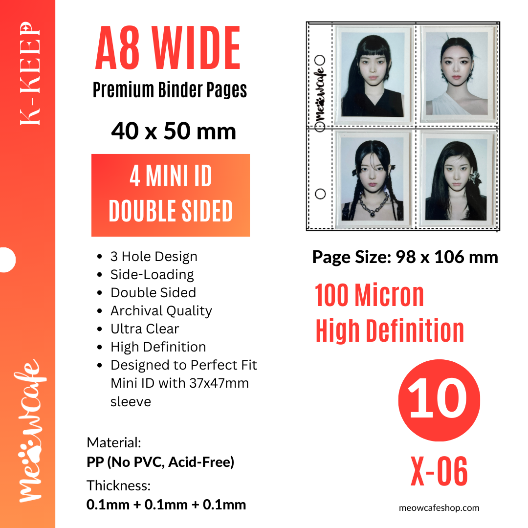 ![K-KEEP [A8 Wide] 4 Mini ID Pocket - 40x50mm Double-Sided 3 Holes Premium Binder Pages, 100 Micron Thick, High Definition Glossy (Pack of 10) X-06](http://meowcafeshop.com/cdn/shop/files/Photoroom_20250314_132203_medium.jpg?v=1741983833)