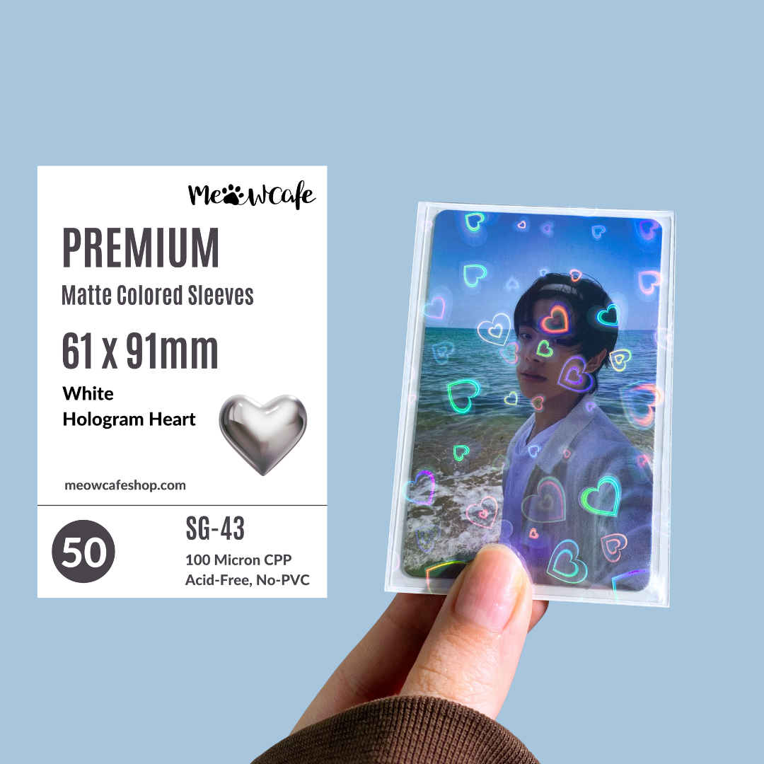 ![Meowcafe [61x91mm] Premium Colored Hologram Matte Sleeves - Hologram Heart White (SG-43)](http://meowcafeshop.com/cdn/shop/files/61x91mm_Colored_Sleeves_medium.png?v=1769197452)